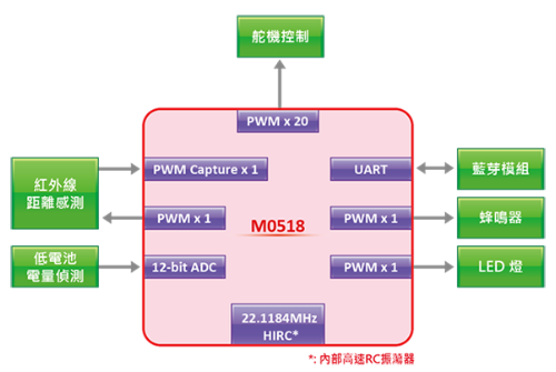 The M0518 series features 24-channel PWM in which the 20-channel PWM is used to control the robot actions and the 4-channel PWM can be used to achieve other functions. Specifically, the 2-PWM is used for distance detection by sending and capturing infrared signals. When there is an obstacle in front of the robot, the robot will reflect the issued infrared signals and then confirm if the coding of the issued signal captured by PWM is consistent to determine if there are obstacles ahead; if there are obstacles, make the robot back to avoid hitting.