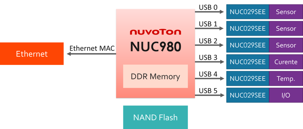 This platform uses the USB port to design an 8-way full-speed USB host port and uses the USB port to replace the connection measurement module at any time. The NuMicro® NUC980 with NuMicro® NUC029SEE USB device measurement module provides a complete development platform that shortens the overall development cycle.