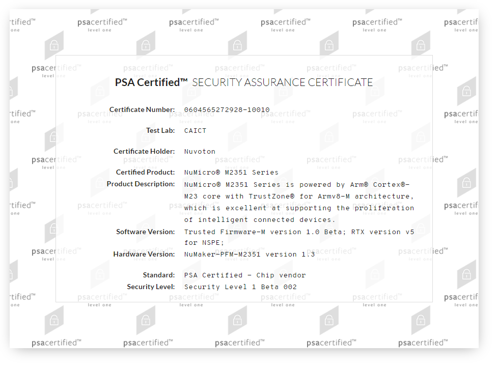 新竹, 台湾 – 2019年2月26日 –新唐科技, 微控制器领导厂商今日正式对外展示通过了Arm® PSA (Platform Security Architecture) 认证计划中要求的安全级别的检测成果。 这成果显示了NuMicro® M2351微控制器是世界首颗基于Arm® Cortex®-M23内核能通过Arm® PSA Certified Level 及PSA Functional API Certified的微控制器。 这相当的展示了新唐M2351系列微控制器被应用在物联网产品设计上的可靠性。认证检测的单位是在位于北京隶属于中国信息通信研究院的泰尔终端实验室 (CTTL-Terminal Lab, CAICT)。