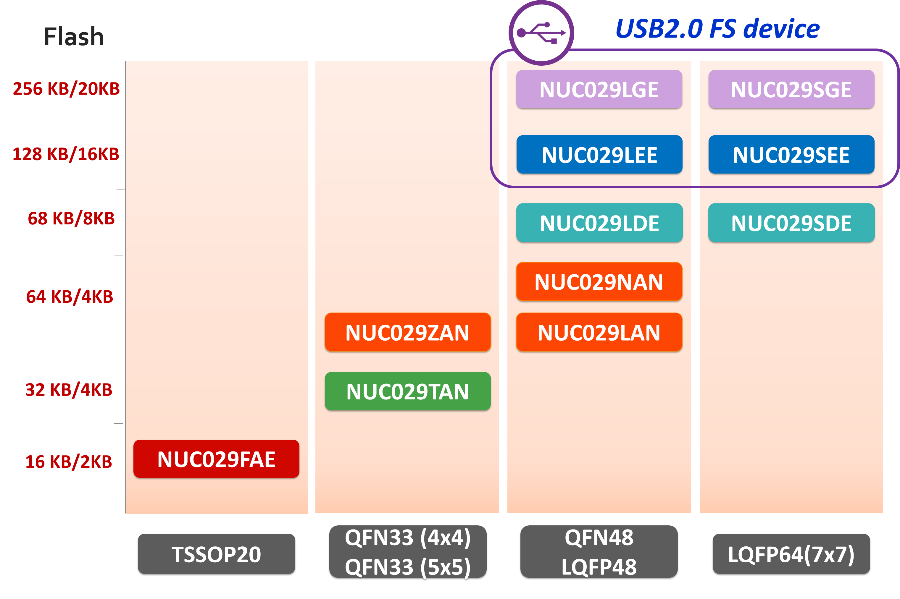 NuMicro® NUC029 系列共有 12 颗型号产品,包含超值入门款组合 NUC029FAE / TAN / ZAN / NAN / LAN、多串口及高速 PWM 组合 NUC029LDE / SDE、无需外挂晶振 USB 组合 NUC029LEE / SEE、高效能 256K Flash, 20K RAM 组合 NUC029LGE / SGE / KGE。系统频率支持 24 MHz到 72 MHz,内建 16K ~ 256K Bytes 程序内存 ( Flash ROM )、2K ~ 20K Bytes 数据存储器 ( SRAM ) 。产品提供多样封装型式: TSSOP20 ( 4.4 mm x 6.5 mm )、QFN33 ( 4 mm x 4 mm)、QFN33 ( 5 mm x 5 mm )、QFN48 ( 7 mm x 7 mm )、LQFP48 ( 7 mm x 7 mm )、LQFP64 ( 7 mm x 7 mm ) 与LQFP128 ( 14 mm x 14 mm )。